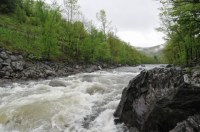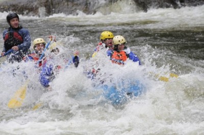 Yes I said changing, as in: ALL NEEDED WAS PROVIDED FOR (previous night worry and last minute trip to store: not needed- this is when I begin to suspect “Someone” might be tapping on my shoulder) from the snug little booties to the helmet, full wet suit, waterproof over jacket and LIFE (phew) JACKET. Honestly suiting up with “wet” wet suits is not a fun project to consider (go ahead think about it) never mind actually do. But despite having to wrestle ourselves into them, it seemed like the wise and prudent thing to do since water temperature was to be @ 35 degrees. The reality of what this felt like I got to confirm later. We dropped off our clothes and gear in the car as we headed for the busride which would take us to the departure point.This is where I got my first glimpse of our Guide, although I did not know it at the time. What I will say is my husband and I spent the ride in laughter about the hilarious possibilities as we eavesdropped on a conversation about the River we would be rafting which was peppered with words like: dynamite, caves, and tunnels as well as local town history tidbits.