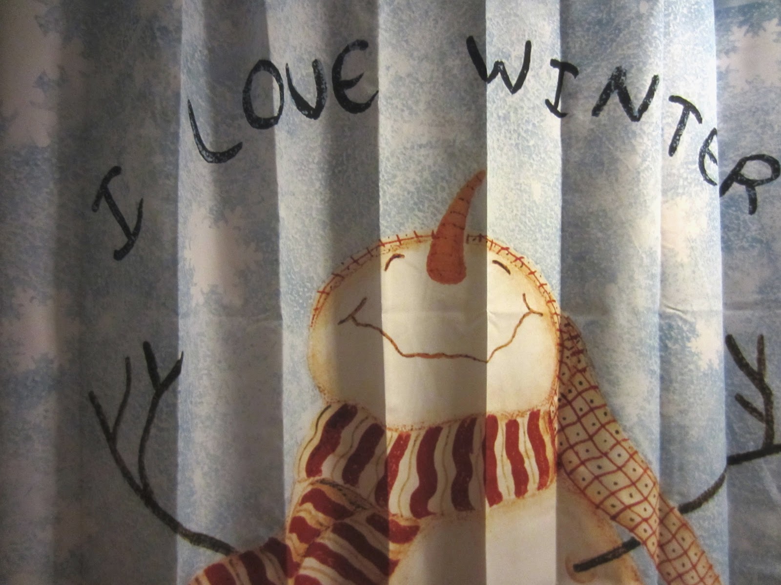 My hubby has been bringing me home little gifts all week. One of which was this winter themed shower curtain. Working at Lowes when they want to “clear out” items is a bargain lovers blessing. I love it, and winter! My dear daughter hates it. She has a thing about shower curtains and snowmen. Sigh. Can’t please everyone!