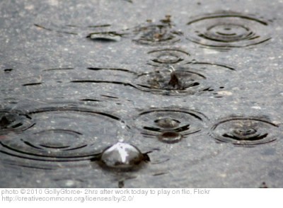 The rain pours down from the clouds,