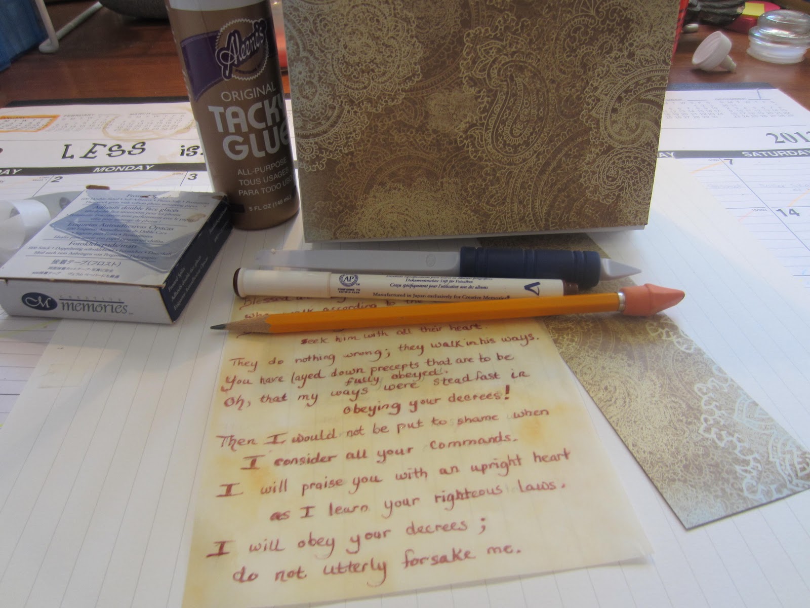 | I enjoy being creative with what is on hand. So last years desk calendar becomes today’s makeover project for my Psalm 119 Challenge! |