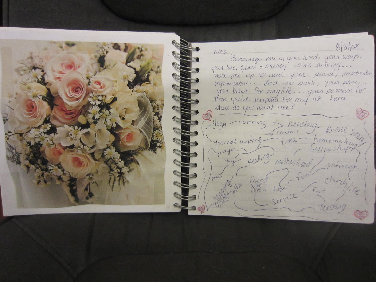 preparations.The bouquet picture was used as the inspiration for my own wedding bouquet. This entry is dated 8/31/02. The pictures below are of the cover of the journal and the pages I am sharing. This is the first of my entries in our new Blog Hop (making good use of all our old journal writing!)!