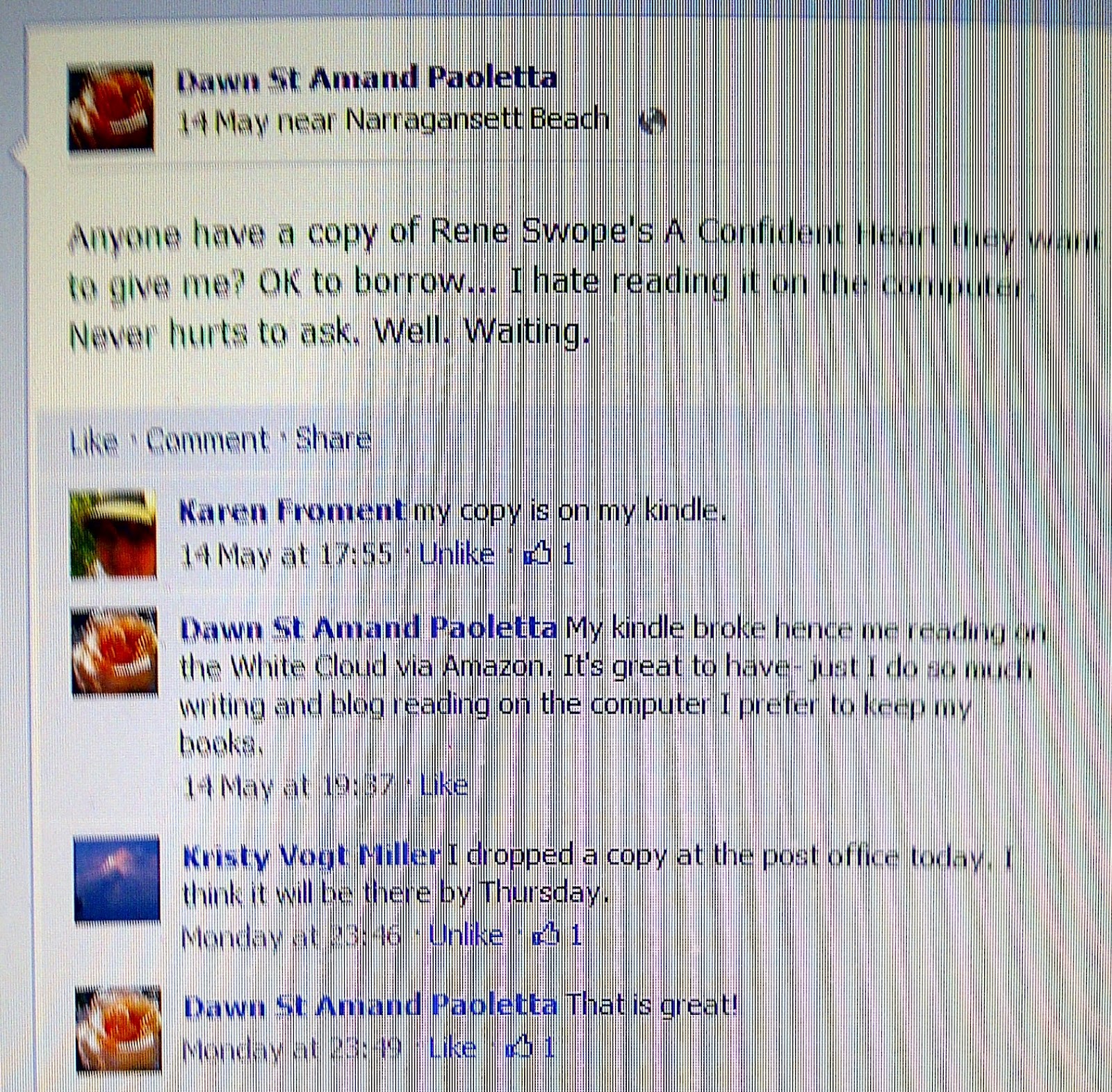 Then between all of my other commitments, obligations and job searching, interviewing, volunteering blogging, life, I got behind. The first week. What a loser, I thought …maybe I can catch up. But then I got discouraged because (here is where I feel like a brat) I loved what I read but I could not stand reading on the computer after I was done all of the other computer stuff…So I put forth on Facebook a random request…and let the thought of catching up be for another day.