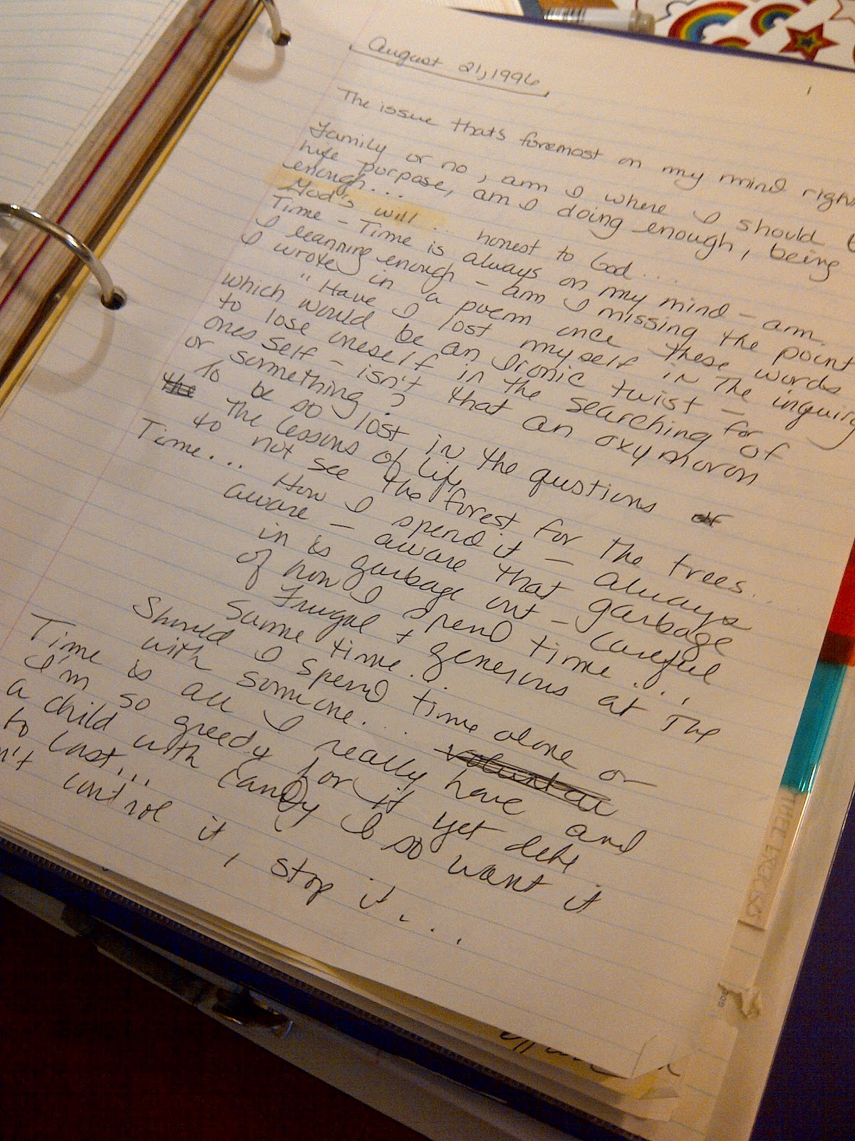 Today for my Random Journal Day share, I am going to give some back story, dear ones. Actually, a journal is quite revealing. The day I am sharing is actually from a binder that I used in the days I was very involved in a few Writing Groups. I had accepted Christ in 1992, but without getting grounded in the word and even more than that, unwilling to let go of a relationship that was clearly not the Lord’s will, I slipped into a life of backsliding. Pretty much without even understanding what that meant. God showed me the next year. After that He turned my life upside down and I let Him do so, willingly. I still made some pretty bad choices along the way. I messed up, fell down and got back up…but as a baby going from crawling to walking I finally found my stride. I am still learning not to rush ahead of Him, and how to follow Him without second guessing or double-mindedness. Or shortcuts. But now, we walk, dart playfully, laugh and dance together along the way. He is so good. Keep in mind that when I wrote this, I did not have the assurance of my salvation. I did not understand many of the scriptural truths that are the foundation to my trust, confidence, peace and joy in Him, now. This comes by taking Him at His word. Those who believe God’s word and put their trust in Him will be given much insight and spiritual power, because His word is alive. To trust the word, you have to know it. Not part of it. Not morsel-ed. You have to eat it, digest it, study it and let it seep into your soul. Those who want to take the word and conform it to their own understanding instead of be conformed to it, by it, will be deceived and unable to receive the fullness of His grace. That’s my opinion. And I believe I have the Spirit of God.
