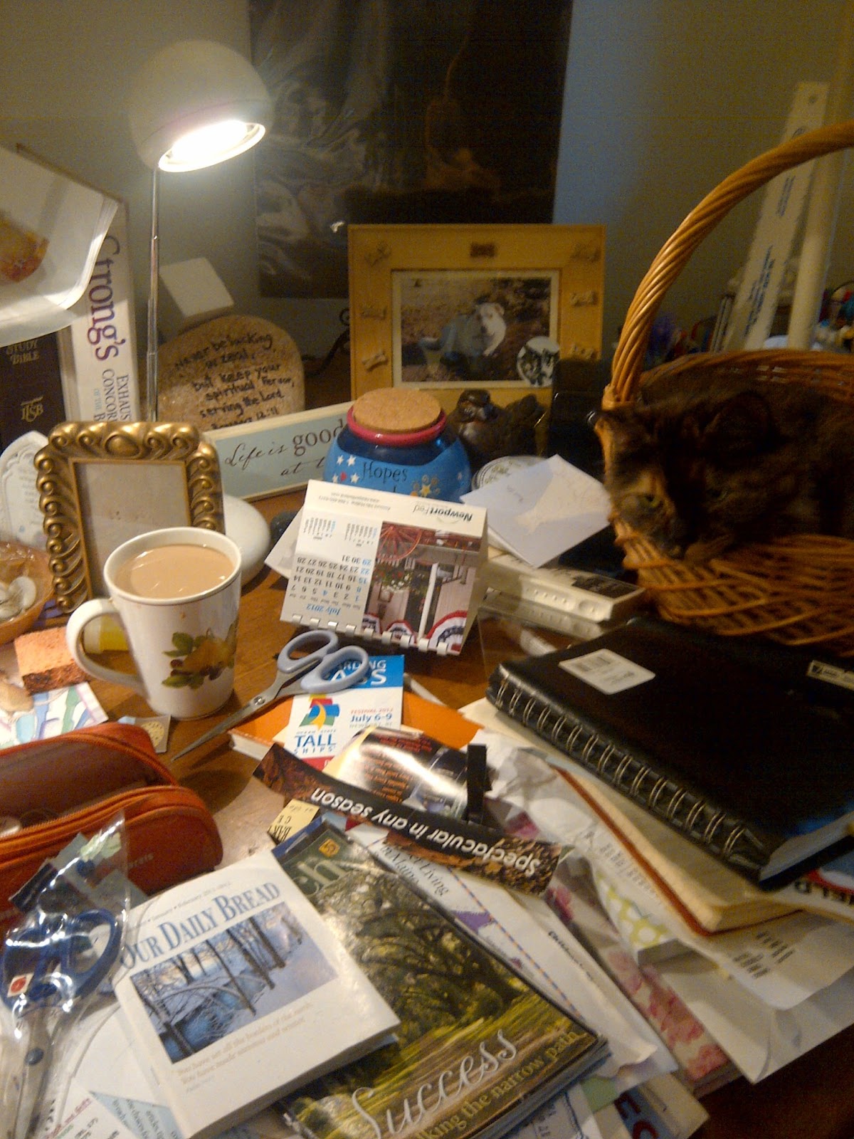 Hi Dawn – Okay – so – I couldn't decide which of your latest posts to comment on because they were all “hitting” me!! This one the most since my office looks like your desk. I know the place . . . seems a 24/7 situation for me – and still – I manage to move forward and I don't even know how. Yes – do email me – what's going with homeschool and you and what happened with the devotional circle journal ideas? Look forward to hearing from you!!Joy!Kathy