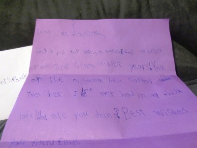 Joining me for this venture was a special boy who I have come to adore, named Evan. Who just happens to be moving up to the next group after three years of partnering with me along this journey. Who for the last two years has joined with me for the New Year plunge into frigid cold water in January. Who has also taught me more than I probably have taught him…who I am going to miss. Next year will be my first year teaching Sunday School without Evan. I know that I will still love and pray for the students God gives. And enjoy each one of them. I know I will stay a Sunday School Teacher as long as God says, STAY. But this Sunday, Evan came in and handed my an envelope, with a note in it. I asked if he would like to read it to me. And He did. Before our little class. Whence I learn but again, the blessing of trusting God, instead of winning the argument with Him. And I learn that life is all a letting go. Again. A trusting of God, and all He gives. A receiving, and letting go continuum. And I wonder that He doesn’t make the student a teacher to keep them a student of His grace and truth, wholly reliant on Him. Knowing that any good to come of this venture- will be because of His wildly amazing grace and mercy. Because, for all sake and purpose I would be a lousy pick for a Sunday School Teacher after all. Except that God and Evan don’t seem to agree.