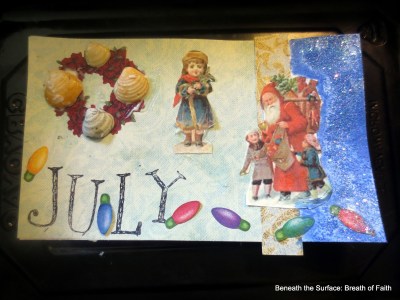 My latest ICADs seemed to embrace a theme. Winter. Since we have been having a steady stream of hot days, my mind wandered to cooler themes. I had some vintage pictures and sea shells I integrated, also a few stickers via Creative Memories. 3 white beach pebbles account for our Snowman- perhaps he should go by “Rocky” not Frosty! I used Stampin’ Up stamps for the July letters. Acrylic and watercolor paints, sharpies. Oh and I almost forgot…SPARKLES!