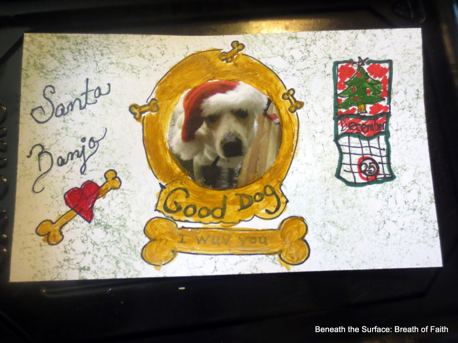 | Santa Banjo- our dog won a spot in a 2013 Calendar- He is December’s boy! |