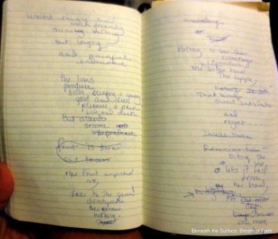 | This is how the poem The Apple looked in my journal as it flowed from one of my journal times. I like to share poems with the dVerse group on Tuesdays but also would like to publish my unpublished poems at some point. I know I could improve greatly…but it is a journey I am willing to pursue, as God leads, in His time. |
