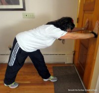 3. Modified Hamstring/Pyramid: Using wall for support bend forward from hips, keeping chest lifted, until you feel stretch in back of the front leg.