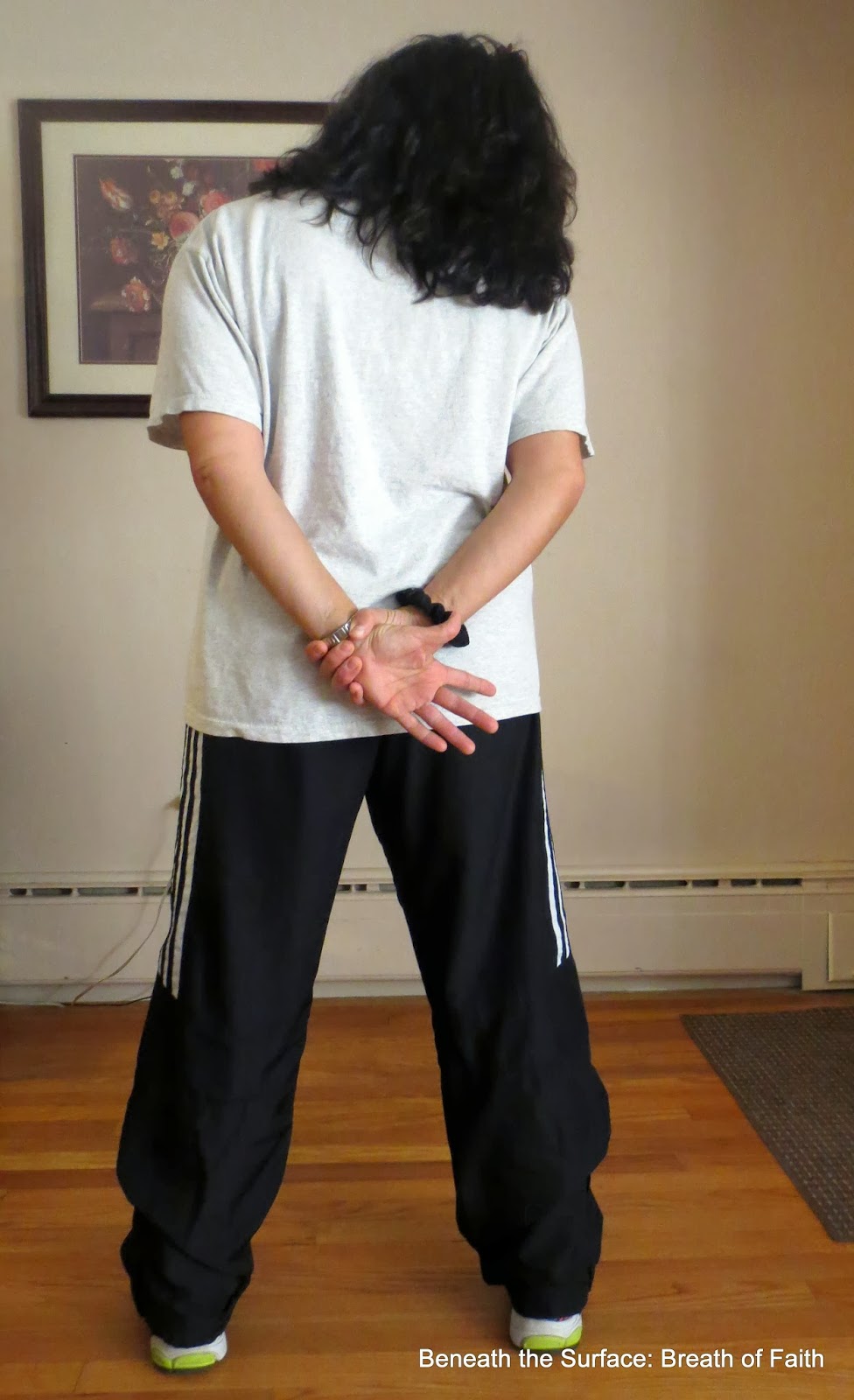 clasping hands is optional- feel stretch in shoulders and chest