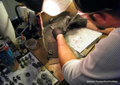 In addition to the designs in his collection and Etsy Shop Brandon also does custom designed work. I love the detail that Brandon brings to his work. The fact that this jewelry definitely appeals to men and women is a great aspect. My hubby already told me he wants his own necklace. My mom bought one and I have my eye on one as well. I am excited to tell you that Brandon has offered one of YOU a necklace of your choosing from his collection! The pictures below show Brandon at work at home and a few I snapped at the craft show.
