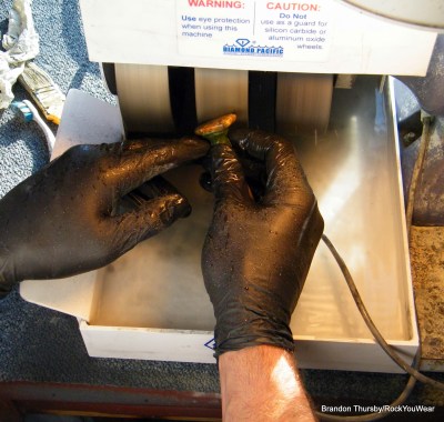 Brandon’s work recently underwent it’s own transformation when he had the opportunity to participate in a workshop taught by Michael Boyd, a nationally renowned jewelry designer, metal-smith, and lapidary artist. Brandon showed me the stones he created before the class and his work since the experience. Although all of his work, is lovely to behold, he pointed out that he is aware of different tools and polishing techniques that have helped him refine his craft and the quality of his work. My untrained eye was able to discern a subtle difference in the sheen and shape of the stones. Artist and art are ultimately in a state of perpetual growth, change and transformation, after all.