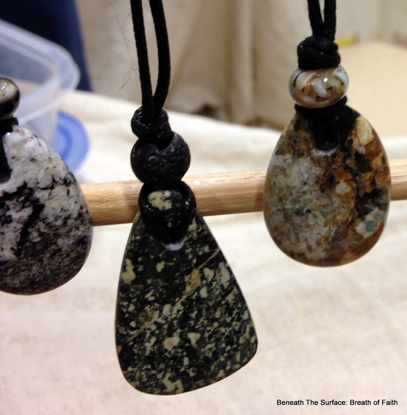 Brandon started experimenting with rock carving about two years ago. He was inspired to design something unique for himself to wear that wasn’t overly feminine, and also derived from nature. You might say jewelry design is in the genes, as his mom also designs jewelry and ornaments, using locally found sea glass, as well as various other mediums. Initially borrowing his mom’s tools, Brandon fashioned a unique stone necklace which grabbed the attention of others, and gained him such positive feedback, he decided to create more. Not only did stone carving bring him enjoyment and satisfaction, but Brandon’s hobby offered new opportunities. As his hobby and collection grew, he decided to invest in his own tools and seek to establish himself in business.