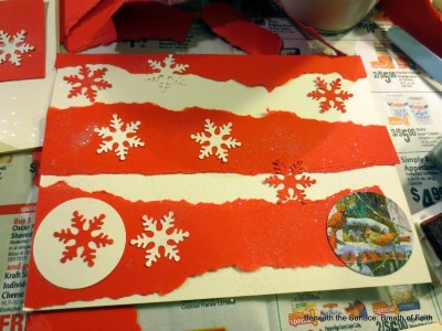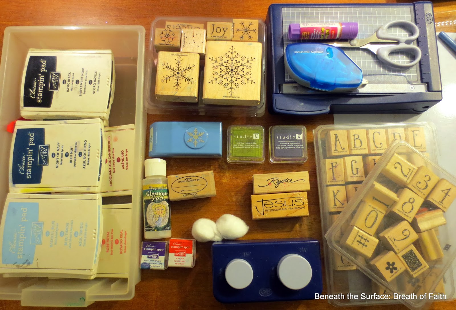 I would choose color themes for the night based on my mood, and then stamp away. Please let me know if you have a question about anything I used, which is also grouped in a picture below! I favor this Snowflake stamp set I got through Stampin’ Up, years ago. It is so versatile. Plus, I love snow! I also used some of my Creative Memories punches, and tools. And sparkly fairy dust. One can never have enough sparkle, in my opinion. It’s actually called Glamour Dust by DecoArt. I love sparkles. I also had random pieces of paper and card pieces I implemented.