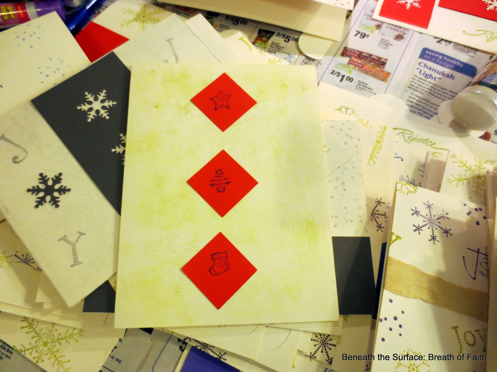 Pictured below are the various cards I made. All by whim. I do really enjoy, making some uniquecards, and then doing some assembly line style! The latter way is the best way to go if you want to do a lot, but I did them in November, over the course of 3 or 4 sittings. One could easily do 25-50 in one sitting if you stick with one style and stamp away assembly line style.