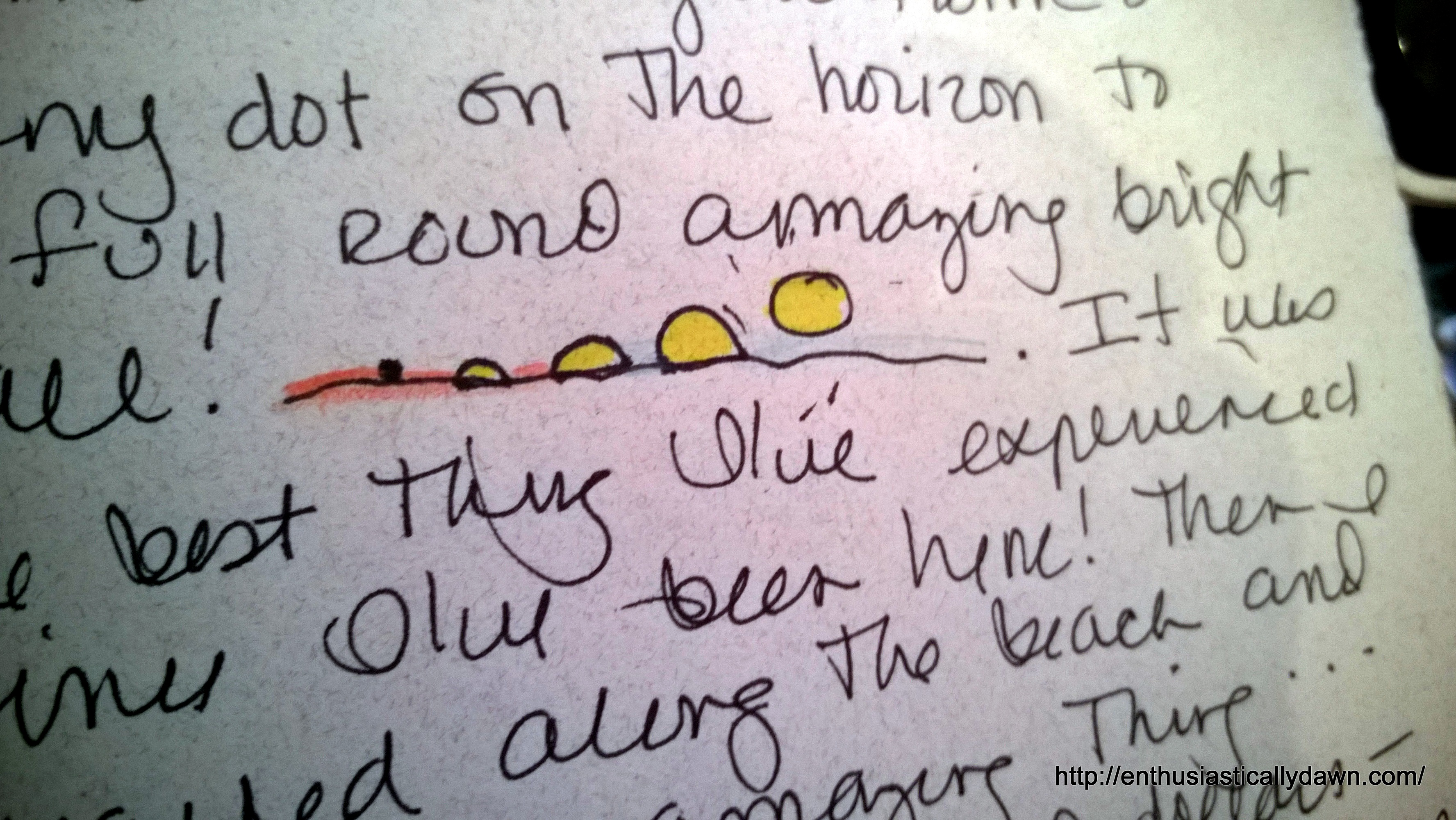 The sky was orange and I kept watching and waiting, walking along the water’s edge, listening to the waves. It was 6:10 AM when the tiniest dot of light appeared. Within seconds, to my amazement, the tiny ball began to rise. It was so fast, but wonderful to witness.