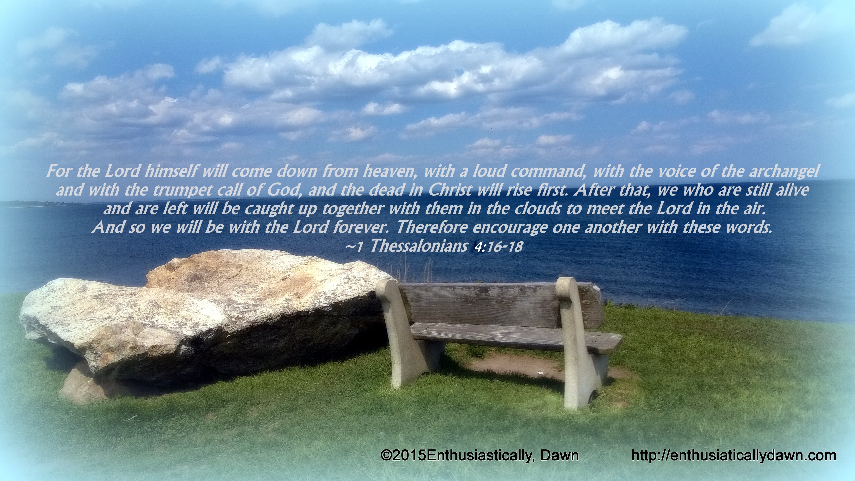 For the Lord himself will come down from heaven, with a loud command, with the voice of the archangel and with the trumpet call of God, and the dead in Christ will rise first. After that, we who are still alive and are left will be caught up together with them in the clouds to meet the Lord in the air. And so we will be with the Lord forever. Therefore encourage one another with these words.