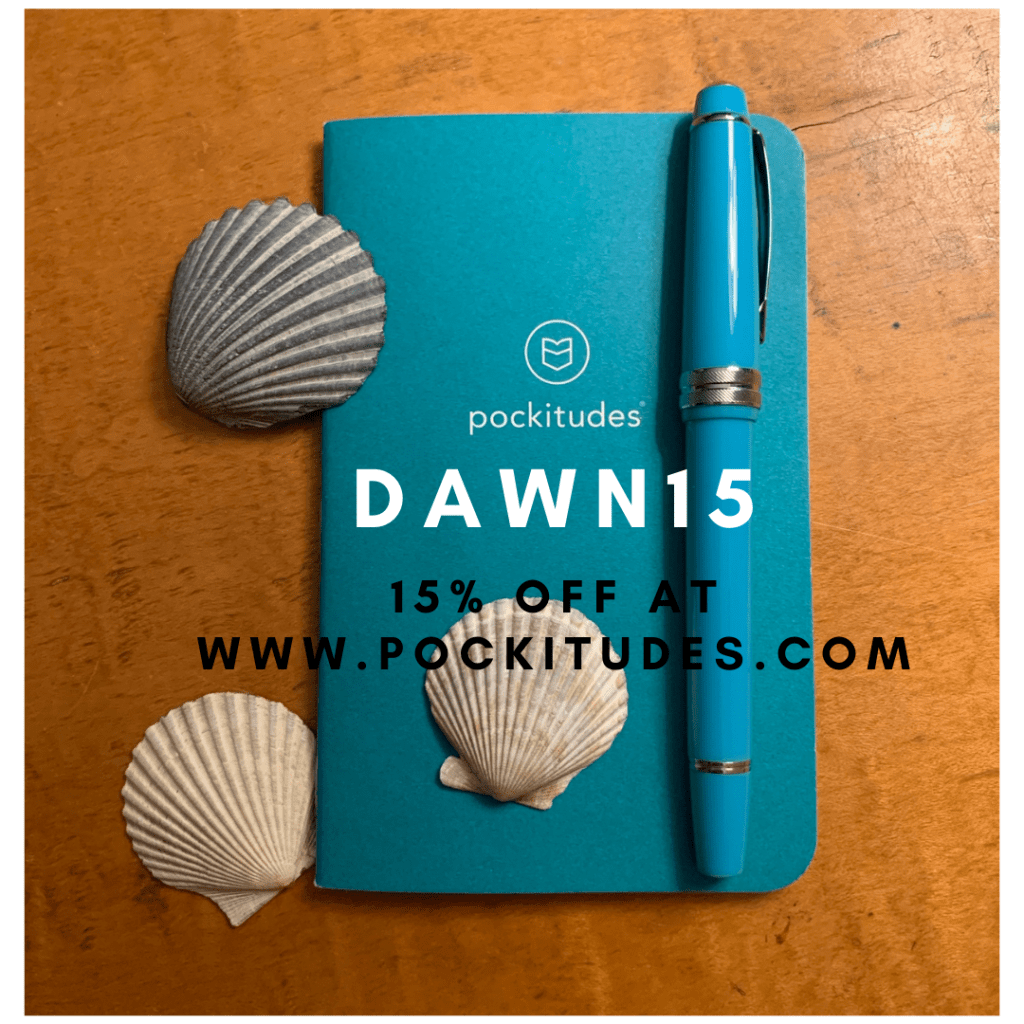 Lastly, they come in a beautiful assortment of colors and artistic, creatively decorated covers. My first pack was called “Elements”. But once I discovered the variety is was hard to choose. Hence the five initial pacs I bought. I suggest you buy one- Frederic and Team Pockitudes have allowed me a discount code for friends: use DAWN15 for 15 percent off your purchase- and after you fill one and give two away, you treat yourself to more! That’s my plan.