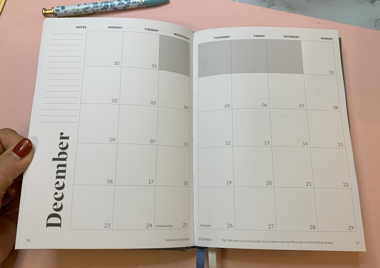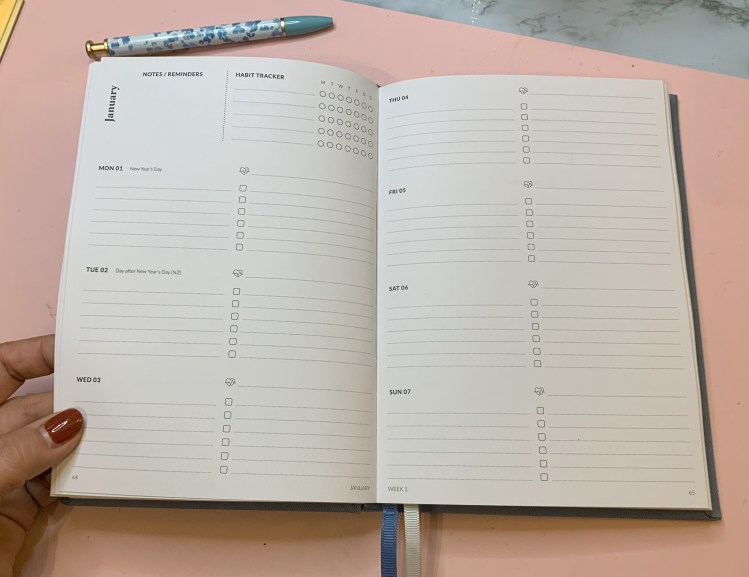 - Visuals: The size – for me, this A5 size is exactly what I love. This is an elegant, yet not too flashy diary that one could have on their desk, and out and about. The gold-foil year and Curation are tasteful, and the word itself is a powerful reminder to curate one’s life carefully, and with intention. Practical elegance visually. Two thumbs up on aesthetics externally. AND internally as well. The paper: white (my personal preference, and clean, not cluttered weekly layouts and monthly spreads.