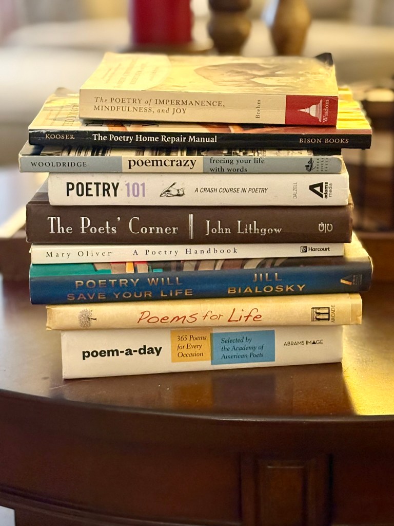 The reason I am choosing nine books instead of ten is so, after reading these choices, you can share the tenth in the comments with me! I know there are many more good books and deeper books on this subject. I have a few. But these I chose by the memory evoked when I looked at them. Maybe it was the timing I received, the person who gave, or what I gained from the book- but these books, upon sight, brought a smile or sense of pleasure as I remembered them. I’d love to know the poetry books, or writing books that have been a pleasant addition to your understanding of poetry, writing, or just a favorite poet. Let’s jump in!
